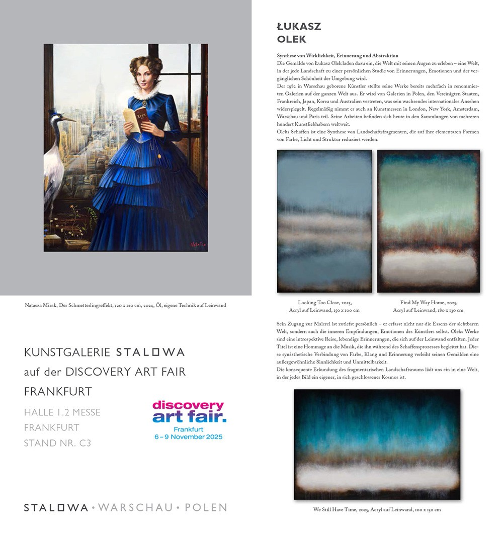 It is one of the most important events dedicated to contemporary art in Germany, bringing together galleries, collectors, and art lovers from all over Europe.At our stand, we will present selected works by six exceptional artists: Natasha Mirak, Łukasz Olek, Michał Prażmo, Kamil Stańczak, Mariola Wawrzusiak, and Daniel Krysta. Their work combines individual style, reflection on the contemporary world, and high-quality craftsmanship, for which Galeria STALOWA is known.