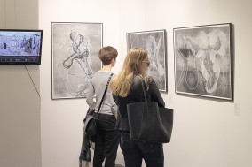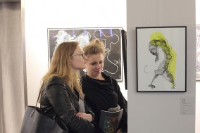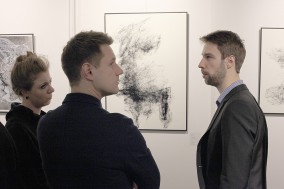 At this exhibition predominate works from the series „Kinetic Matter” and „Mattery Deliverance”, due to their cyclic continuation there is a chance to compare works from different periods. ”Kinetic Matter” is an author’s form of graphics based on linocut and enriched with different means of expression such as: pen drawing, acrylic or ink. Drawing and graphics elements are set in uneven grey surface sometimes becoming black, which highlights depth and infinity. The subject and form both loosely refer to kinetic theory of matter, which implies that matter consists of constantly moving atoms. This aspect is directly connected to philosophy of transformation, conversion and disintegration, which has constant presence in the artist’s work.