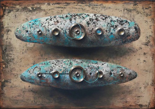 oil, own technique, slag aluminum, 23 carats gold on canvas