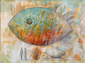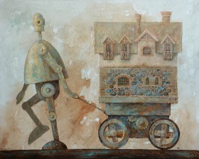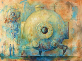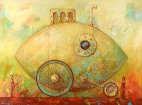 konstrukcji, melancholijnych kobiet i anonimowych, symbolicznych postaci męskich. Drobiazgowo namalowane latające statki wydają się stać w miejscu i powtarzać za artystą pytania o upływający czas. Od strony technicznej struktura obrazu jest urozmaicona bogatą fakturą oraz wysmakowaną, często monochromatyczną kolorystyką.