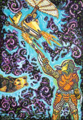 He gives a toast and a hummingbird urges Predator to hug the alien, 2016