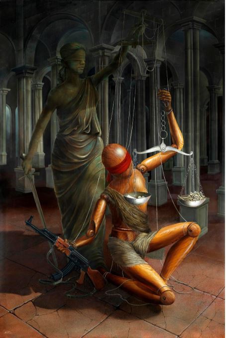 oil, own technique, slag aluminum, 23 carats gold on canvas
