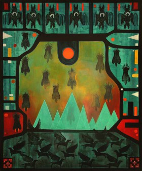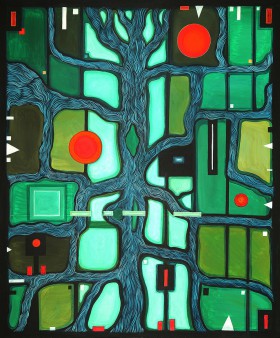 flamaster i akryl na surówce bawełnianej, technika własna, instalacja