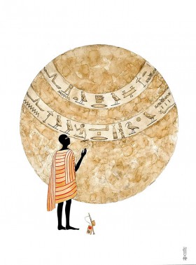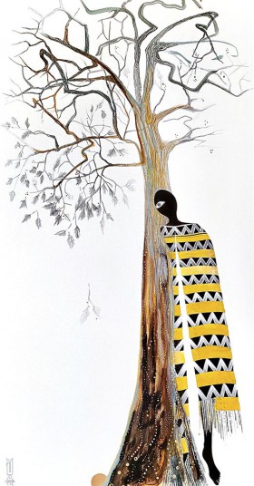 kawa kolumbijska, grafit akwarelowy, atrament, złoto mineralne, papier wielowarstwowy