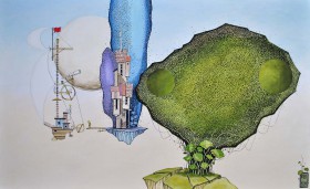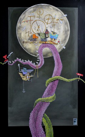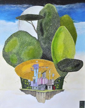 ceramika patynowana na drewnianej podstawie, akryl, złoto naszkliwne