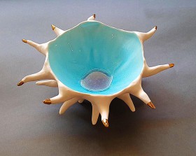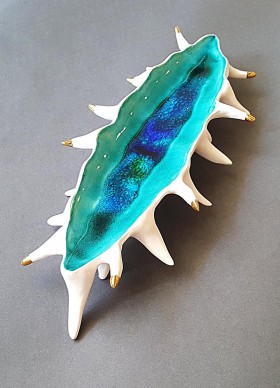 biała porcelana z ręcznie formowanymi kolcami, szkliwiona, z wtopionym szkłem witrażowym. Zdobiona upłynnionym 22-karatowym złotem, wypalana w temp. 1220 C