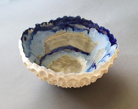 biała porcelana z ręcznie fakturowaną powierzchnią zewnętrzną, szkliwiona i wypalna w temp. 1245 C