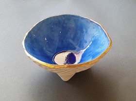 biały porcelanowy trójnóg z ręcznie wytłaczanymi wzorami, szkliwiony z wtopionym szkłem witrażowym. Zdobiony upłynnionym 22-karatowym złotem, wypalany w tem. 1220 C