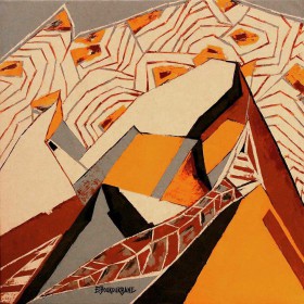 ceramika patynowana na drewnianej podstawie, akryl, złoto naszkliwne