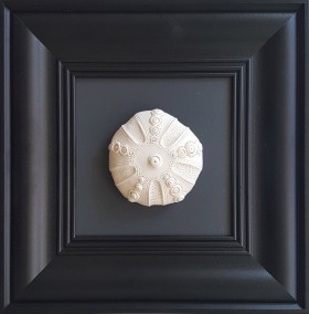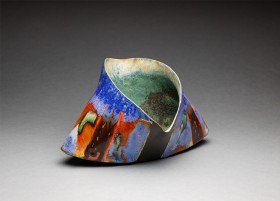 ceramika patynowana na drewnianej podstawie, akryl, złoto naszkliwne