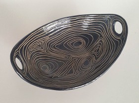 kamionka formowana z płata, zdobiona techniką sgraffito (wydrapywanie wzoru), wypalana w temp. 1130 C