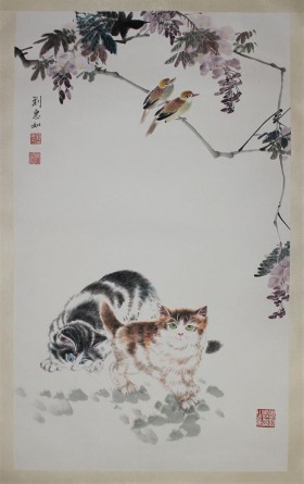Two Cats, Two Birds, Wisteria