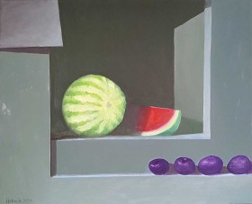 ceramika patynowana na drewnianej podstawie, akryl, złoto naszkliwne