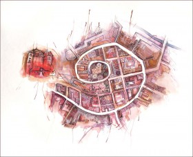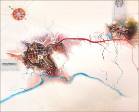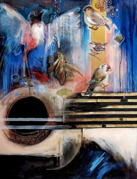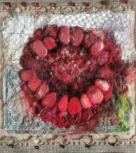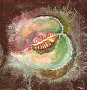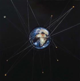 sklejka, gwoździe, obraz z kolorowych nici (bez użycia farb)