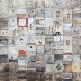 sztuka algorytmiczna na sklejce, gwoździe, nici