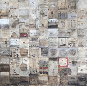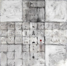 sklejka, gwoździe, obraz z kolorowych nici (bez użycia farb)