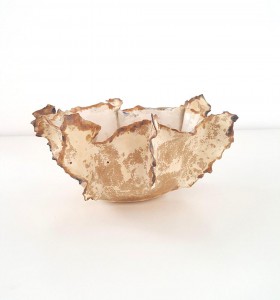 kamionka toczona na kole, wypalana w technice saggar, zdobiona związkami metali i materiałem organicznym