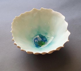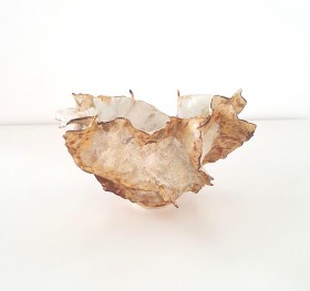 biała porcelana z ręcznie formowanymi kolcami, szkliwiona, z wtopionym szkłem witrażowym. Zdobiona upłynnionym 22-karatowym złotem, wypalana w temp. 1220 C