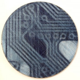 sklejka, gwoździe, obraz z kolorowych nici (bez użycia farb)